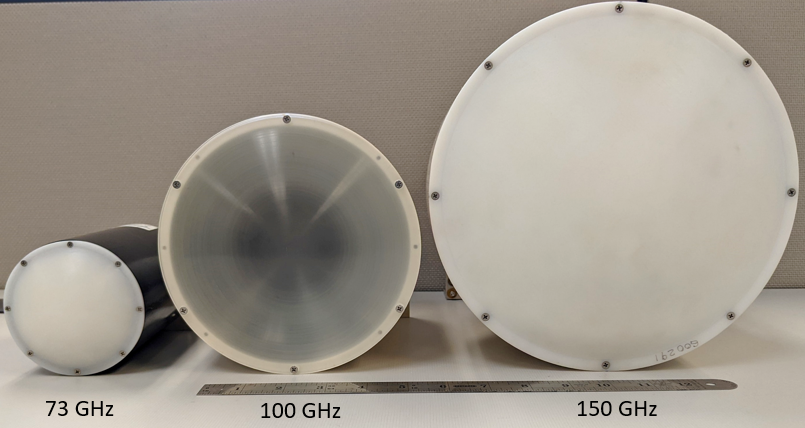 Another modality of imaging is lens-focused imaging. Lens-focused imaging uses a physical lens to focus microwaves in a small area at a specific distance, similar in operation and design to an optical lens. This provides for very high spatial resolution images. However, the focusing capabilities of lenses are frequency dependent and are limited to a specific focal distance and a limited depth-of-focus. In order to change the focal distance, a different lens needs to be used, or the lens detailed design structure must change. These limitations mean that lens-focused imaging is effectively a single-frequency/narrowband approach. Additionally, the lenses tend to be relatively expensive, and almost always custom designed and not readily available off-the-shelf. Pictures of several lenses designed to operate at three different frequencies are shown below.