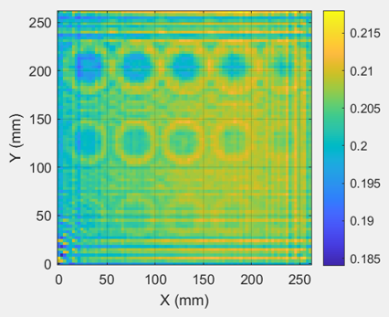 As an example of a microwave imaging scenario, consider the flat bottom hole sample made out of High Density Polyethylene (HDPE, which is polymer) below. This sample contains holes of three different radii and five different depths, for a total of 15 holes. Due to the radius of the smallest hole and the spacing between the holes, a Ka-band (26.5-40 GHz) open-ended rectangular waveguide was selected as the probe. The probe was connected to a VNA in order to make the measurements (S11 at each measurement location). At 26.5 GHz the wavelength is ~11 mm. This sample was scanned at two different standoffs (i.e., distances between the probe aperture and the sample), namely: 16.5 mm and 36.5 mm to produce near-field and far-field microwave images. A 260 x 260 mm area was scanned with a step size of 3 mm in both the X and Y directions.
