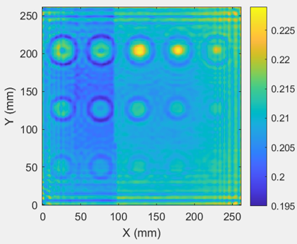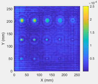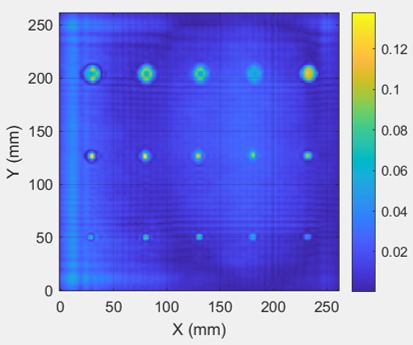 From these scans, four images were produced, which are shown below. The top left image shows the raw imaging data at a frequency of 26.5 GHz and a standoff of 36.5 mm, while the top right image shows the same but at a standoff of 16.5 mm. On the bottom left, the wideband synthetic aperture radar (SAR) image is shown. In this image, all of the frequency points (201 points between 26.5 and 40 GHz) from each measurement point (7569 points) are included in the imaging algorithm that produces a higher resolution, high fidelity image. The bottom right image shows a single frequency SAR image focused at the bottom of the sample. In comparing the SAR images to the raw images, it can be seen that all 15 holes are clearly visible in the SAR image with better contrast between the holes and the background, and the size of the image indications is more on par with the physical size of the holes. In comparing the two SAR images, it can be seen that the wideband image appears clearer.