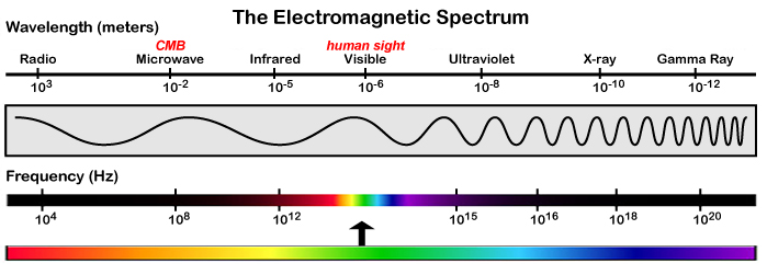 One defining characteristic of an electromagnetic wave is its frequency, which is related to its wavelength and its energy. These concepts will be discussed more in a following page. The electromagnetic spectrum, which encompasses the full range of frequencies electromagnetic waves can have, is shown below.